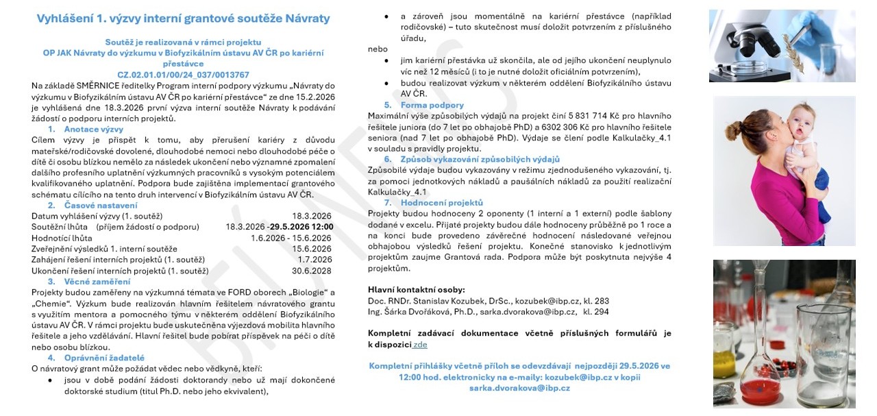 Biofyzikální ústav Akademie věd České republiky (BFÚ) byl založen v r. 1955 a stal se významnou součástí infrastruktury výzkumu v Československu, později v České republice. V současné době se vědci BFÚ věnují základnímu výzkumu v různých oborech biofyziky, biologie a chemie. Výzkum se realizuje pomocí řady biofyzikálních metod, jako je konfokální mikroskopie založená na fluorescenčních metodách, vícekanálová flow-cytometrie, CD spektroskopie, počítačové modelování a elektrochemie. BFÚ představuje výzkumné centrum ČR, ve kterém jsou studovány epigenetické děje v genomu. Z praktického hlediska je věnována pozornost i radiační ochraně a její výuce na MU v Brně. Svojí činností vědci BFÚ přispívají ke zvyšování úrovně poznání a vzdělanosti v ČR, k rozvoji biotechnologií a transferu výsledků výzkumu do praxe. V rámci předmětu své činnosti vědecké týmy BFÚ rozvíjejí mezinárodní spolupráci, včetně organizování mezinárodních vědeckých konferencí, seminářů a zaškolování zahraničních studentů a postdoktorandů v laboratořích, které jsou vybaveny moderními technologiemi. Ve spolupráci s vysokými školami vědci BFÚ vychovávají studenty, významně se podílejí na pedagogické činnosti několika univerzit v ČR. Výukové aktivity jsou realizovány především ve spolupráci s Masarykovou univerzitou v Brně a Univerzitou Palackého v Olomouci. Vedení ústavu aktivně podporuje mladé vědecké pracovníky, snaží se rozvíjet jejich talent a prohlubovat jejich zájem o vědecké bádání. Z hlediska genderové rovnováhy podporujeme ženy ve vědě, konkrétními nástroji a opatřeními umožňujeme skloubení úspěšného profesního rozvoje a rodinného života, včetně zajištění péče o děti.