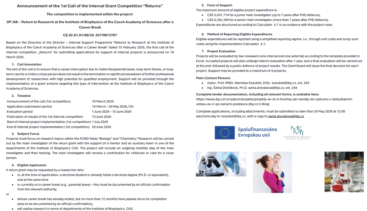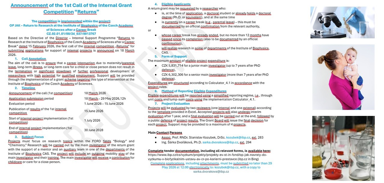 We aim to consolidate our position as a national center for excellent research, while at the same time, we are working on strengthening our position internationally. Every year more than 50 scientists of IBP participate at national grant projects and educate more than 70 pre-graduate and post-graduate students. Many scientists are (were) the principal investigators in international projects, such as projects guaranteed by Norwegian funds, EU grants Marie Curie, COST projects, projects supported by Howard Hughes Medical Institute, or Welcome Trust. The management of IBP promotes scientific research, also using the internal institutional support. In the Institute, we want to create suitable conditions for ground-breaking discoveries in biological and chemical sciences. For the best scientists, academic freedom, as well as financial and technical support, are guaranteed. The professional work is reflected by the relatively high intensity of citations of scientific contributions, initially investigated at the Institute. Highly reputable scientists work(ed) at the institute: the laureate of the most prestigious national award „Česká hlava“ (the Czech Head Award), and „Neuron,“ prof. Emil Paleček (the number of citations according to WoS is more than 14 000). Also, prof. Victor Brabec (the number of citations is more than 11 000), and laureate of the Academiae Premium, prof. Jiří Šponer (the number of citations is more than 18 000). Prof. Šponer is one of the most-cited scientists of the Czech Republic. Institute management also supports the activities of young scientists, and support women (parents) in science. In the younger generation (up to 35 years), a number of our postdoctoral scientists obtained prestigious Otto Wichterle award (the award of the Czech Academy of Sciences). Following scientists were awarded: Jiří Fajkus, Olga Nováková, Jiří Šponer, Miroslav Fojta, Jana Kašpárková, Stanislav Hasoň, Luděk Havran, Václav Brázda, Judit Šponerová, Lukáš Kubala, Jaroslav Malina, Roman Hobza, Martin Falk, Kamila Réblová, Veronika Ostatná, Hana Pivoňková, Michaela Pekarová, Zdeněk Kubát, Soňa Legartová a Vojtěch Novohradský, Miroslav Krepl, and Lenka Marková. We believe that internationally-recognized scientists of the Institute, as well as the promising young generation of scientists, guarantee a long-lasting and the high-level of science at the Institute of Biophysics.