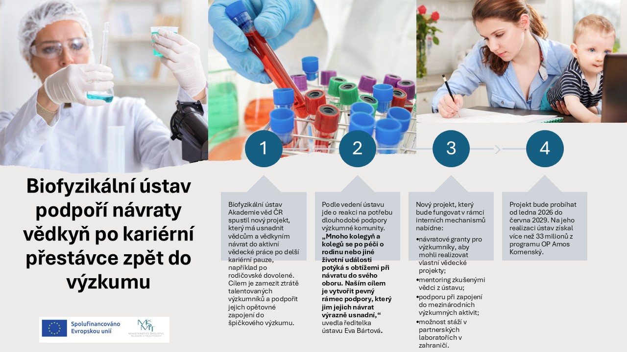 Biofyzikální ústav Akademie věd České republiky (BFÚ) byl založen v r. 1955 a stal se významnou součástí infrastruktury výzkumu v Československu, později v České republice. V současné době se vědci BFÚ věnují základnímu výzkumu v různých oborech biofyziky, biologie a chemie. Výzkum se realizuje pomocí řady biofyzikálních metod, jako je konfokální mikroskopie založená na fluorescenčních metodách, vícekanálová flow-cytometrie, CD spektroskopie, počítačové modelování a elektrochemie. BFÚ představuje výzkumné centrum ČR, ve kterém jsou studovány epigenetické děje v genomu. Z praktického hlediska je věnována pozornost i radiační ochraně a její výuce na MU v Brně. Svojí činností vědci BFÚ přispívají ke zvyšování úrovně poznání a vzdělanosti v ČR, k rozvoji biotechnologií a transferu výsledků výzkumu do praxe. V rámci předmětu své činnosti vědecké týmy BFÚ rozvíjejí mezinárodní spolupráci, včetně organizování mezinárodních vědeckých konferencí, seminářů a zaškolování zahraničních studentů a postdoktorandů v laboratořích, které jsou vybaveny moderními technologiemi. Ve spolupráci s vysokými školami vědci BFÚ vychovávají studenty, významně se podílejí na pedagogické činnosti několika univerzit v ČR. Výukové aktivity jsou realizovány především ve spolupráci s Masarykovou univerzitou v Brně a Univerzitou Palackého v Olomouci. Vedení ústavu aktivně podporuje mladé vědecké pracovníky, snaží se rozvíjet jejich talent a prohlubovat jejich zájem o vědecké bádání. Z hlediska genderové rovnováhy podporujeme ženy ve vědě, konkrétními nástroji a opatřeními umožňujeme skloubení úspěšného profesního rozvoje a rodinného života, včetně zajištění péče o děti.