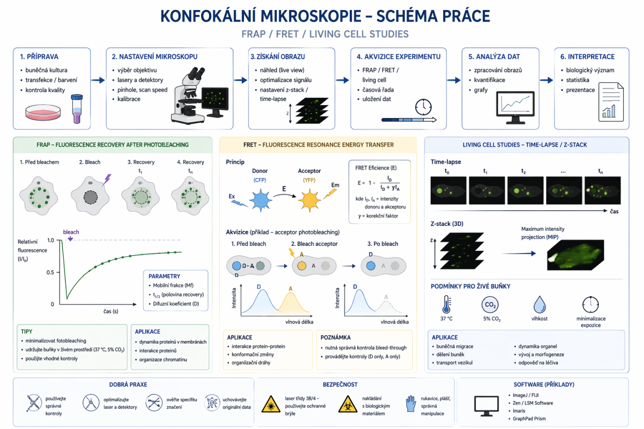 K dispozici jsou mikroskopy s klimaboxem Leica TSC SP5 X a Leica TCS SP8 X SMD. Mikroskopy jsou vybavené WLL laserem, argonovým laserem a lasery s vlnovou délkou 355 nm a 405 nm. Služby jsou závislé na kapacitních možnostech a jejich dostupnost podléhá internímu rezervačnímu systému. Je možná kombinace uvedených technik a také úprava jejich protokolů.
