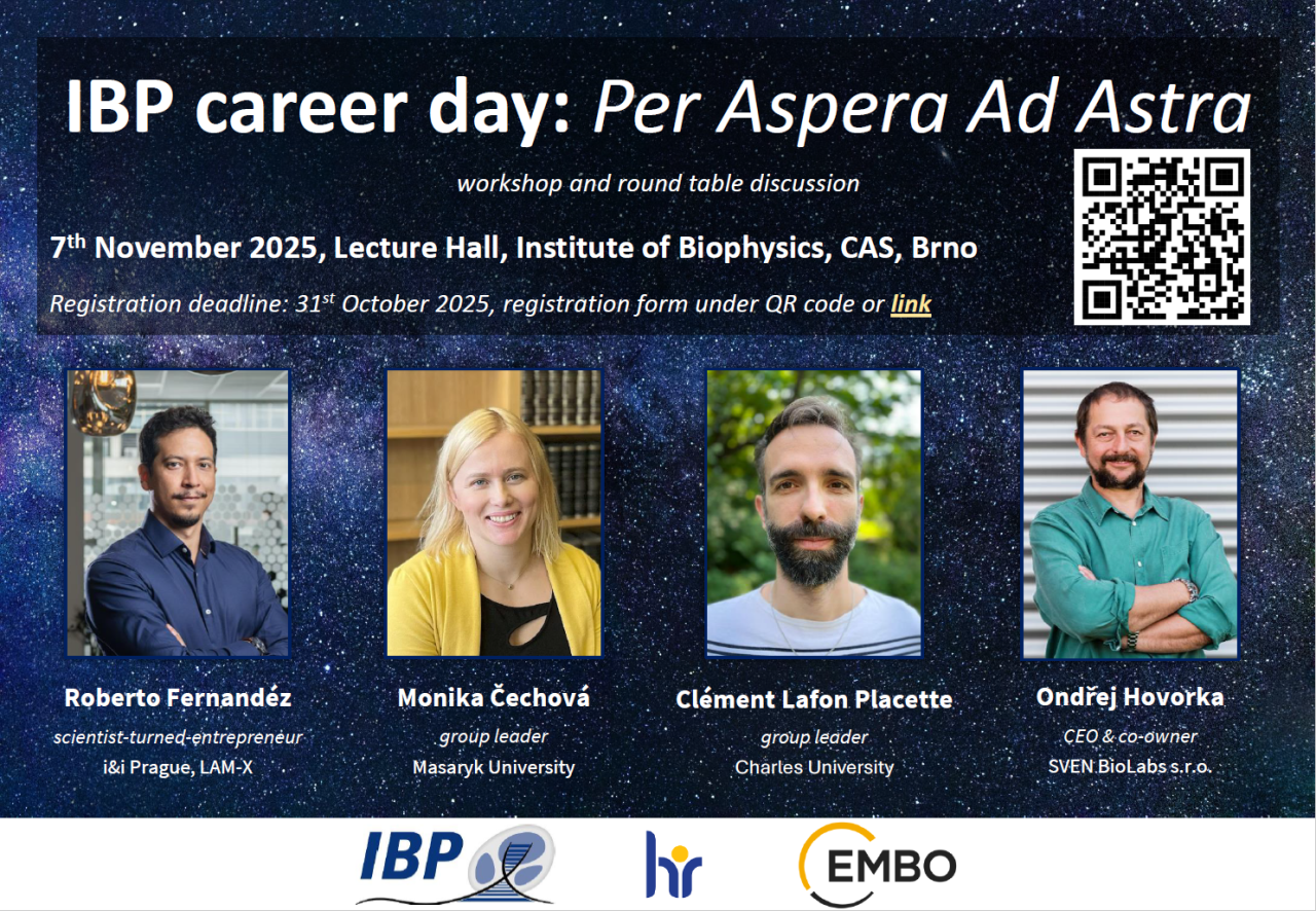 On November 7th, our lab, together with colleagues from across IBP, hosted the fourth edition of the IBP Career Day: Per Aspera Ad Astra. The event was filled with inspiring talks, lively round-table dicussions, and valuable netwroking opportunities. We are deeply grateful for this year's speakers — Roberto Fernandéz, Monika Čechová, Clément Lafon Placette, and Ondřej Hovorka — for their engaging and motivating presentations. Special thanks also go to EMBO for generous support, which made this event possible.🙏