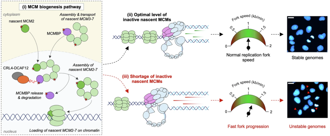 This work uncovers a previously unknown layer of control of DNA replication preceding origin licensing and shows how protein degradation and assembly are coordinated to maintain genome integrity. By revealing how cells regulate nascent MCM production, the study provides important insights into the molecular basis of genome stability and how its failure can contribute to tumor development.