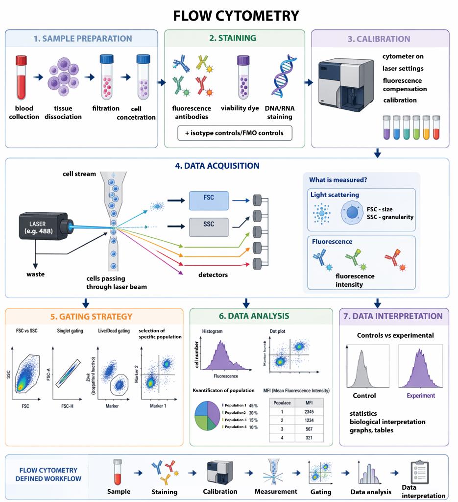 Flow cytometer and 4-way cell sorter equipped with five independently disconnectable lasers (355nm, 405nm, 488nm, 561nm and 639nm) with separated optical paths and fix optics. It uses the principle of hydrodynamic focusing in the environment of high pressure. The instrument can measure FSC, SSC and 18 fluorescence parameters at the same time and also aseptically sort particles up to 4 tubes or multiple-well plate (up to 384-wells), these can be cooled or heated on preset temperature by the connected water bath. The cytometer contains digital electronics, which can detect 70.000 events/sec. in 262.144 channels and sort the particles up to 20 μm size at speed of 40.000 events/sec. in 1.024 channels resolution. BD FACSDiva software is used for a preset of sorting, data acquisition and analysis.